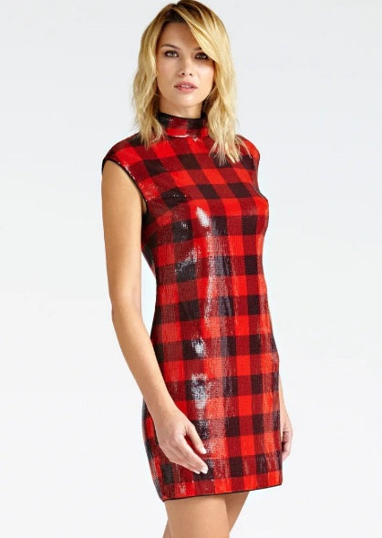Be bold, stylish and irresistible with this striking dress from GUESS. With the iconic red and black check pattern and elegant, shimmering texture, this mini dress is the perfect choice for an evening event, party or special occasion.
